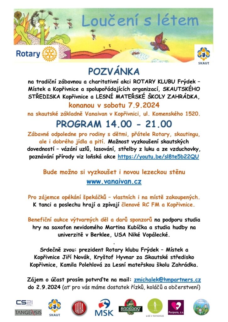 Loučení s létem Publikováno 29/08/2024 | Autor: Šumi Po zahajovačce (příspěvek níže) proběhne odpoledne také již tradiční akce Loučení s létem. Všichni jste zváni.